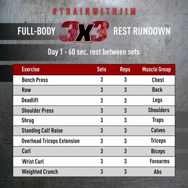 Typical exercises used in the 3-3-3 workout cover various muscle groups. For example, you might include: