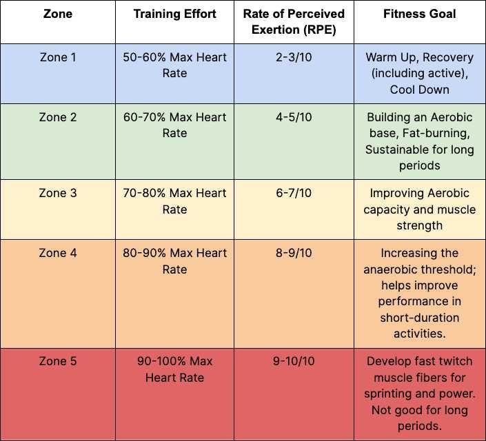 Each zone has specific training benefits, but Zone 2 offers the best mix for endurance and fat burning.